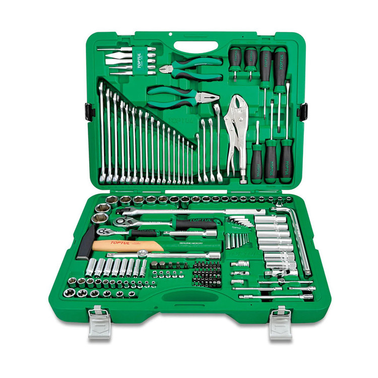 محتویات مجموعه: آچار بکس , آچار یکسر تخت یکسر رینگی , انبر سیمچین , انبر قفلی , انبردست , پتک , پیچ گوشتی , دسته جغجغهای , سری بکس , سری پیچگوشتی